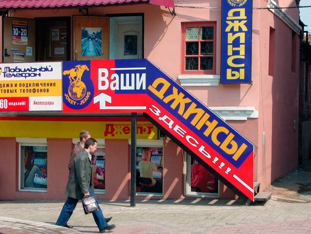 Один из самых креативных примеров информационно-рекламной вывески – джинсы, набитые синтетическим наполнителем и высаженные у входа. Минус такой вывески – недолговечность, дождь, ветер и уличная грязь быстро приведут ее в непривлекательный вид. Несомненный плюс – наглядность, креативность и легкость в замене, достаточно взять любые, пусть слегка некондиционные или неразмерные джинсы, и вывеска готова.
